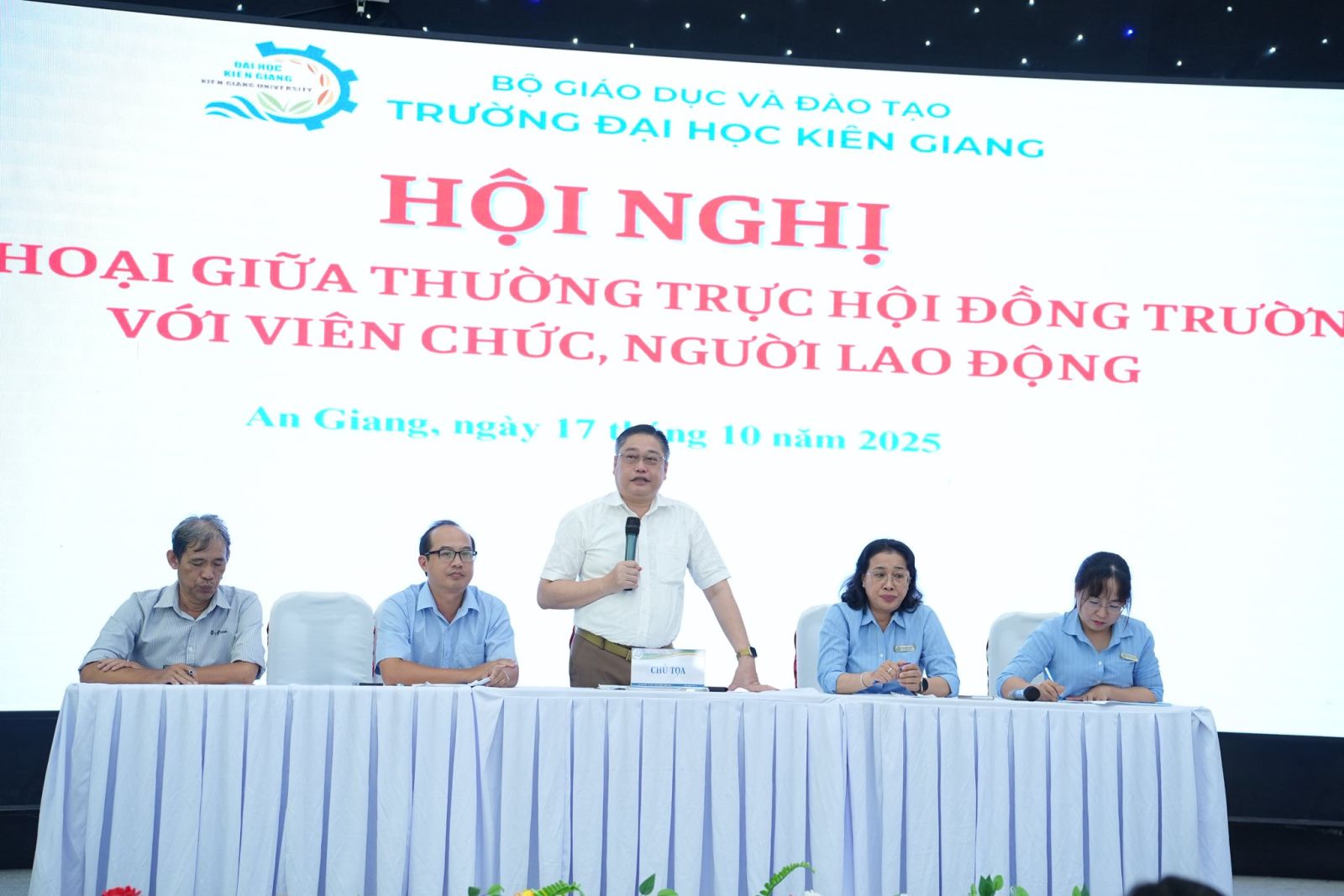 Ngày 17/10/2025, Trường Đại học Kiên Giang đã tổ chức Hội nghị đối thoại giữa Thường trực Hội đồng Trường với viên chức, người lao động năm 2025. Tham dự Hội nghị có Thường trực Hội đồng Trường, Ban Giám hiệu, lãnh đạo các đơn vị cùng đại diện viên chức, người lao động toàn Trường.