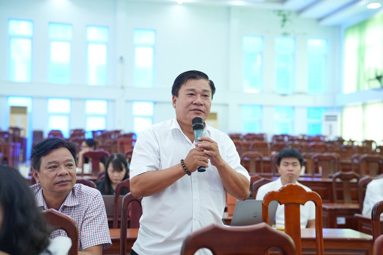 Phần đối thoại diễn ra trong không khí cởi mở, dân chủ và thẳng thắn. Đại diện viên chức, người lao động và sinh viên đã nêu nhiều ý kiến, đề xuất liên quan đến công tác chuyên môn, chế độ, chính sách và điều kiện làm việc. Các câu hỏi, kiến nghị đều được Thường trực Hội đồng Trường trực tiếp lắng nghe, trao đổi và giải đáp kịp thời, thể hiện tinh thần trách nhiệm, cầu thị và quyết tâm đồng hành cùng tập thể trong quá trình xây dựng, phát triển Trường Đại học Kiên Giang ngày càng bền vững.