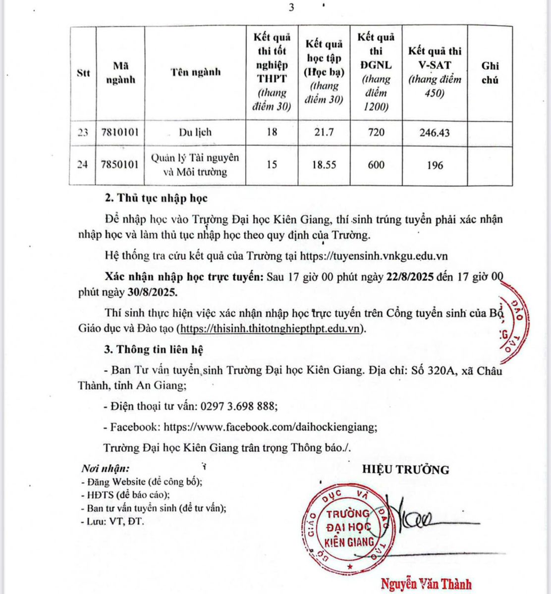 Thông báo của Trường Đại học Kiên Giang về công bố điểm chuẩn trúng tuyển hệ đại học chính quy năm 2025.