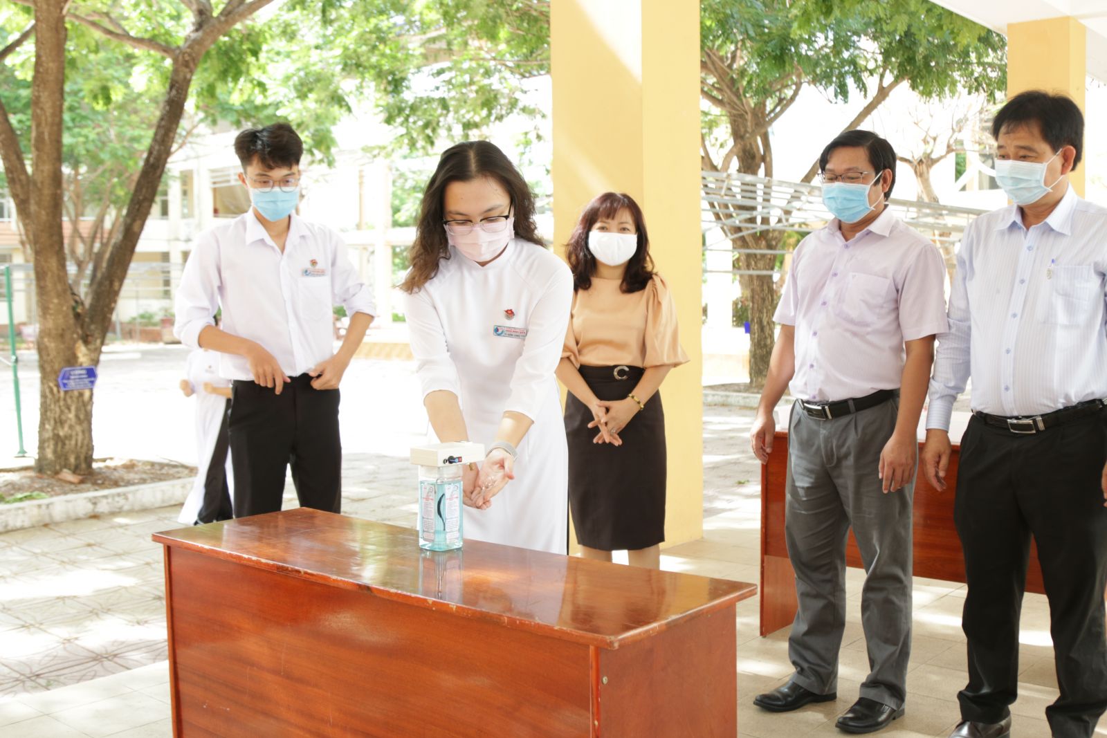 Học sinh Trường THPT Nguyễn Việt Khái sử dụng dung dịch rửa tay khô sát khuẩn qua máy tự động