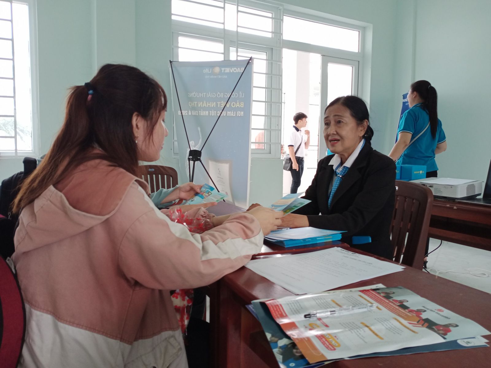 Cô Trương Thị Hương, Trưởng nhóm kinh doanh của Công ty Bảo hiểm Bảo Việt Kiên Giang tư vấn cho sinh viên
