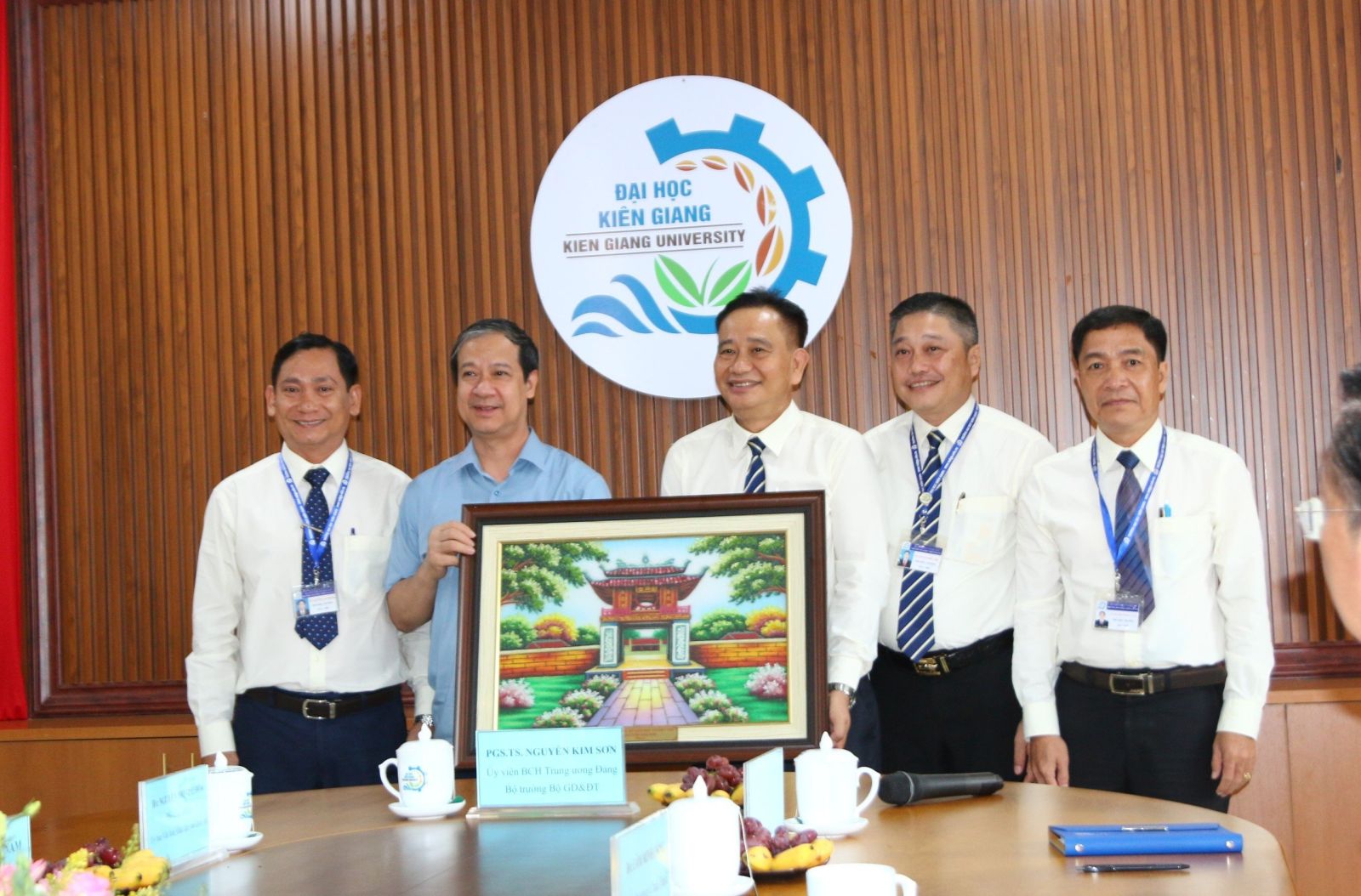 Bộ trưởng Nguyễn Kim Sơn tặng quà lưu niệm cho Trường Đại học Kiên Giang