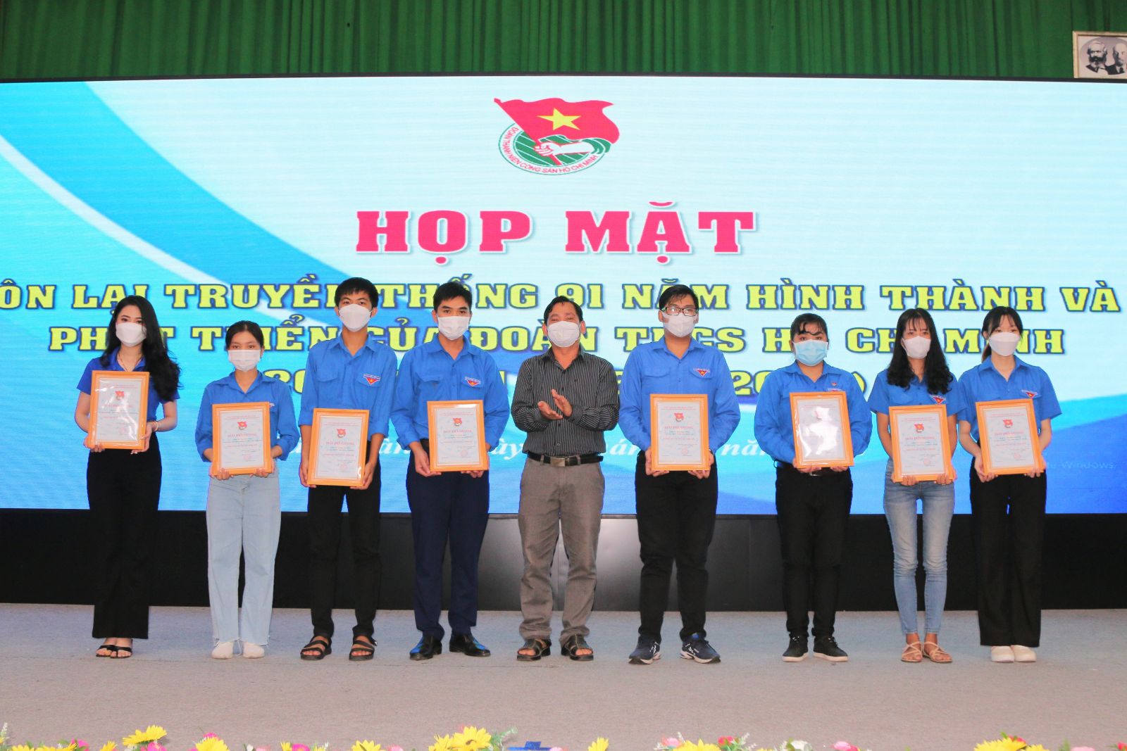 Lê Duy Chương sinh viên năm thứ ba, ngành Sư phạm Toán học, Khoa Sư phạm và Xã hội nhân văn (thứ 3, bìa trái) là gương mặt trẻ tiêu biểu được tuyên dương tại Họp mặt ôn lại truyền thống 91 năm ngày Thành lập Đoàn TNCS HCM