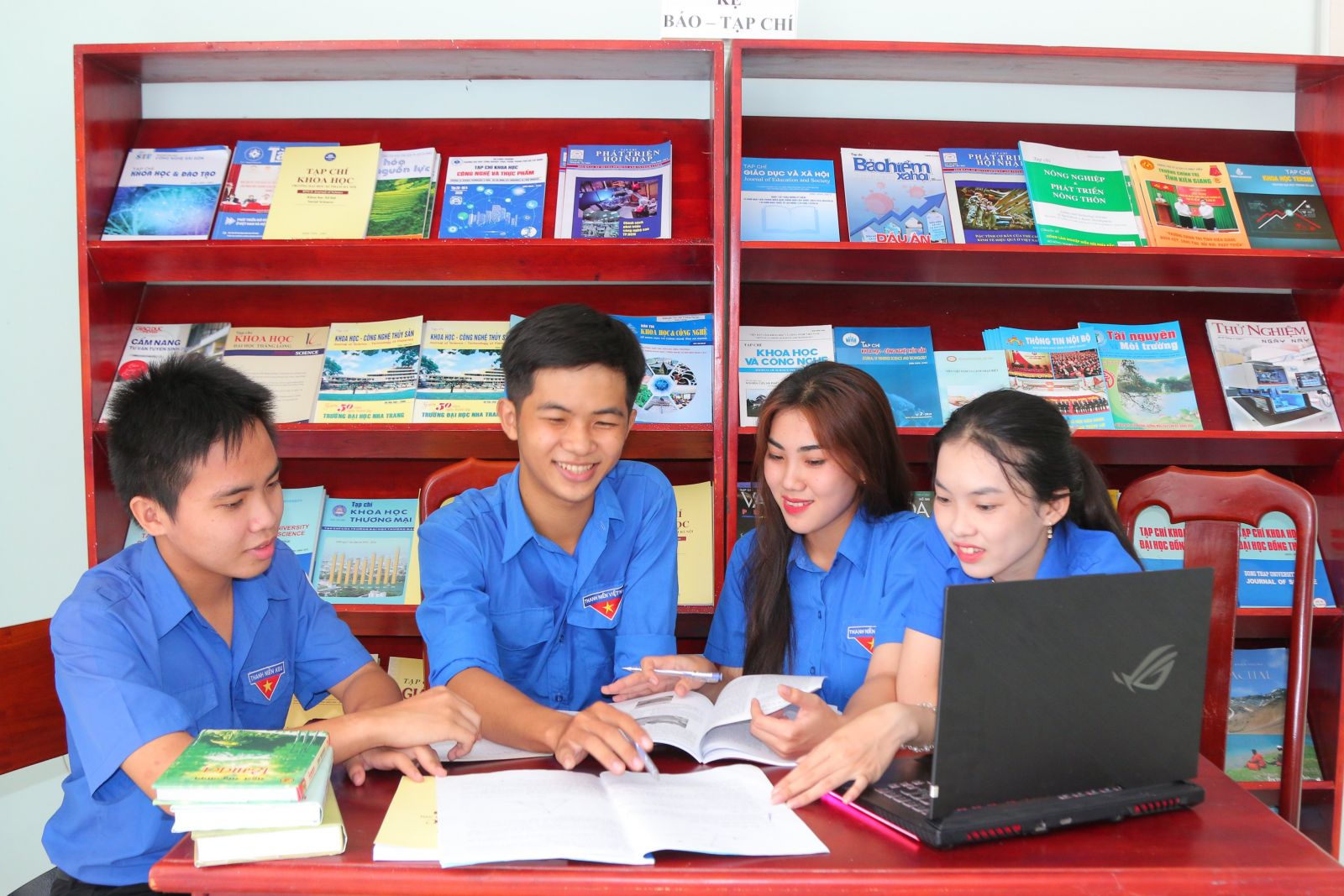 Lê Duy Chương sinh viên năm thứ ba, ngành Sư phạm Toán học, Khoa Sư phạm và Xã hội nhân văn (thứ 2, bìa trái) và các bạn học nhóm tại Thư viện trường