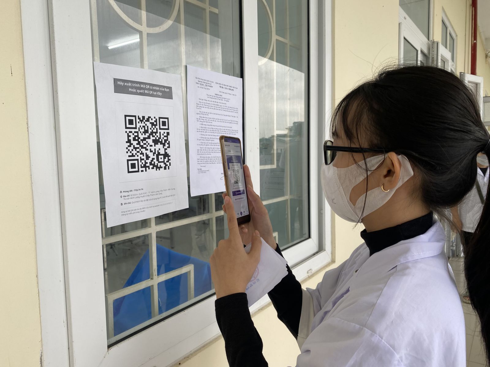 Sinh viên xịt khuẩn tay, quét mã QR-Code trước khi vào khu Thực hành – Thí nghiệm