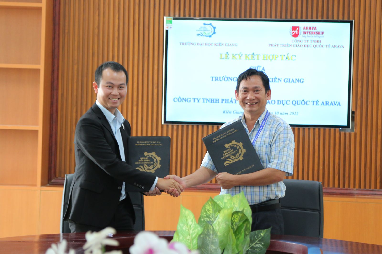TS. Nguyễn Văn Thành – Phó Hiệu trưởng Trường Đại học Kiên Giang và ông Nguyễn Thanh Trung – Giám đốc Công Ty TNHH Phát Triển Giáo Dục Quốc Tế Arava ký kết hợp tác đào tạo chương trình Thực tập sinh nông nghiệp tại Đan Mạch