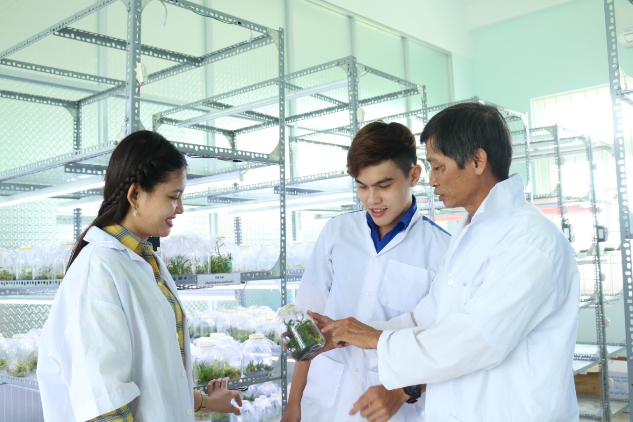 Thầy Dương Văn Nhã (bìa phải) - Trưởng Khoa Nông nghiệp và Phát triển nông thôn, Trường Đại học Kiên Giang hướng dẫn sinh viên nuôi cấy mô.