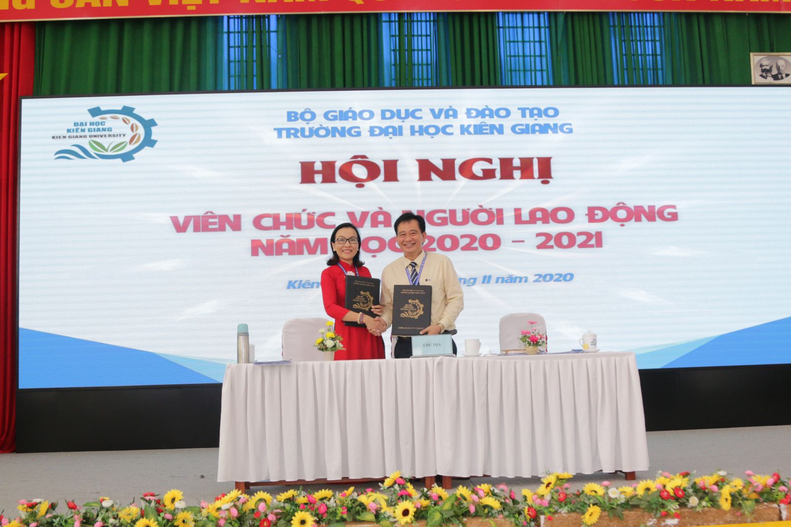 TS. Nguyễn Tuấn Khanh – Hiệu trưởng và ThS.Huỳnh Kim Thủy – Chủ tịch Công đoàn ký kết giao ước thi đua
