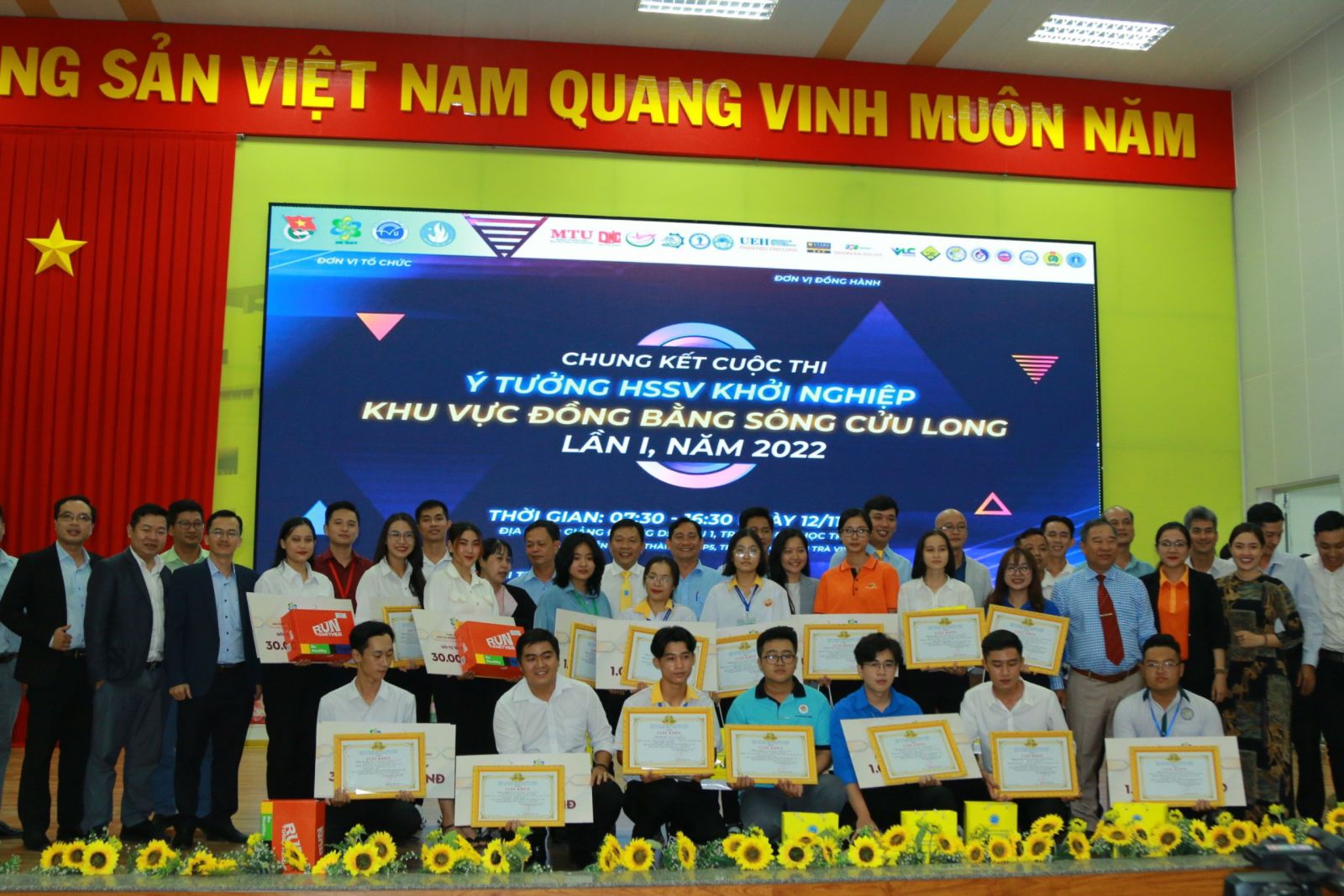 TS. Nguyễn Minh Hòa – Chủ tịch Hội đồng Quản trị Mạng lưới hỗ trợ học sinh, sinh viên khởi nghiệp khu vực ĐBSCL, Hiệu trưởng Trường Đại học Trà Vinh trao giải nhất cho dự án Cá cơm xanh của sinh viên Trường Đại học Kiên Giang