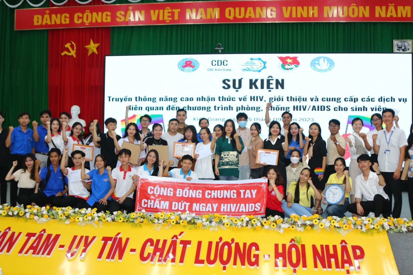 Ngày 25/9, Trường Đại học Kiên Giang phối hợp cùng Trung tâm Kiểm soát bệnh tật Kiên Giang tổ chức sự kiện truyền thông nâng cao nhận thức về phòng, chống HIV/AIDS năm học 2023 – 2024 đến hơn 200 sinh viên.