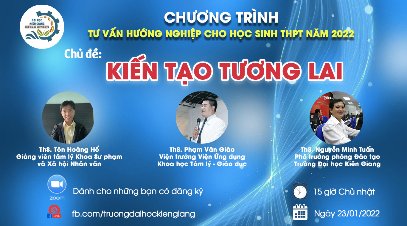 Ngày 23/1, Trường Đại học Kiên Giang đã tổ chức Tư vấn hướng nghiệp cho học sinh THPT năm 2022 với chủ đề “Kiến tạo tương lai” cho hơn 460 học sinh lớp 12 tại các huyện An Biên, An Minh, U Minh Thượng, Vĩnh Thuận. Chương trình được tổ chức online trên nền tảng Zoom và livestream trực tiếp trên trang fanpage của Trường Đại học Kiên Giang.