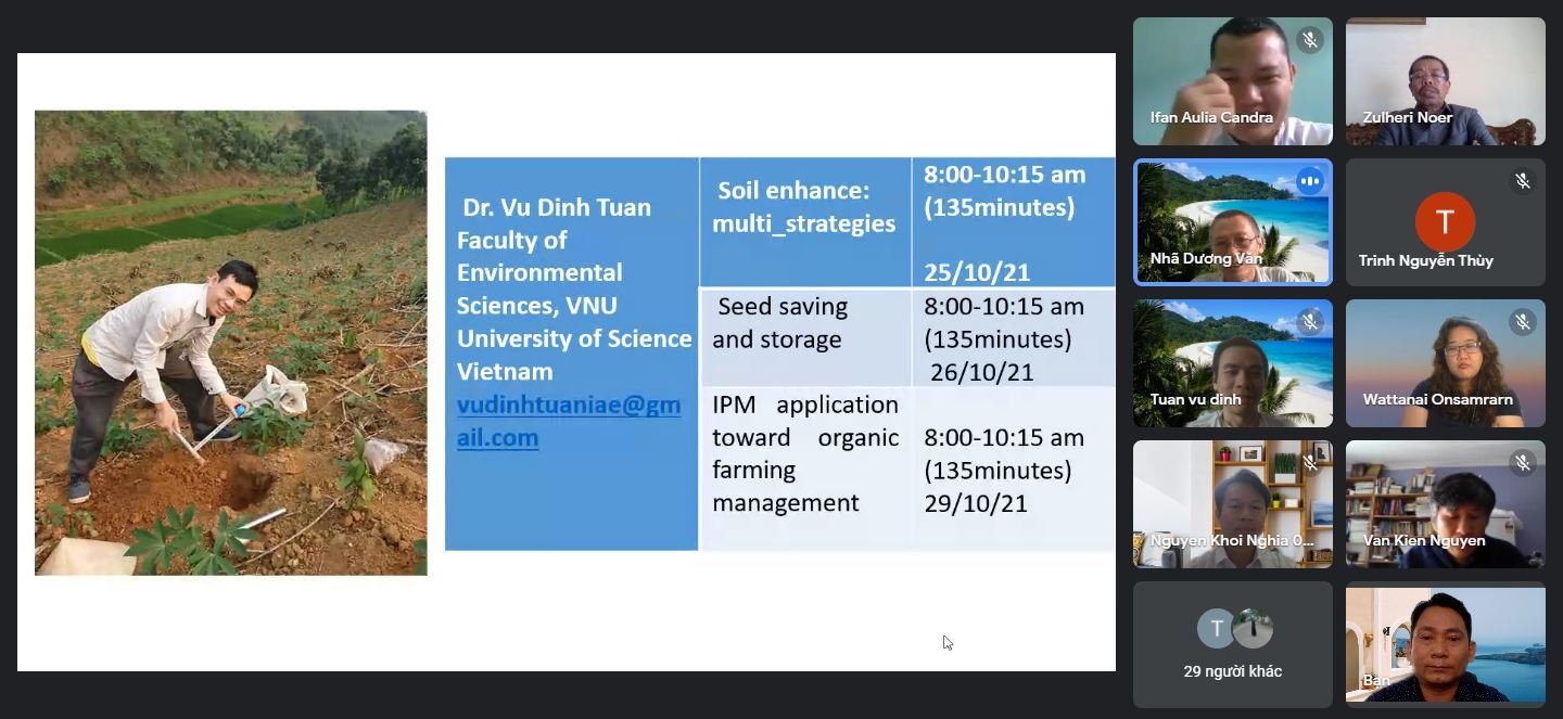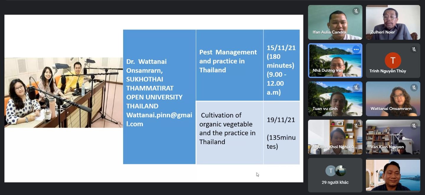 TS. Dương Văn Nhã – Trưởng khoa Nông nghiệp và Phát triển Nông thôn, cho biết tổ chức lớp học trực tuyến học phần “Canh tác hữu cơ, Organic Farming”, 2 tín chỉ, cho 30 bạn sinh viên đến từ Trường Đại học Medan Area. Giảng viên giảng dạy cho học phần đợt này đến từ Trường Đại học Kiên Giang, Đại học Quốc Gia Hà Nội, Đại học Cần Thơ, Giám đốc về hữu cơ Mekong và Đại học mở Sukhothai Thammatirat, Thái Lan.
