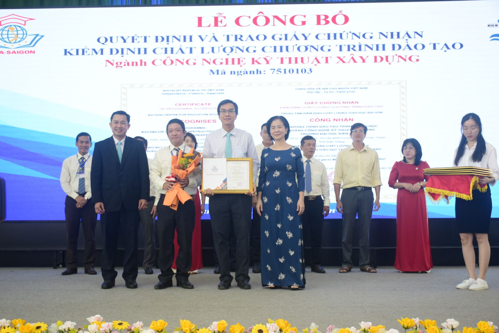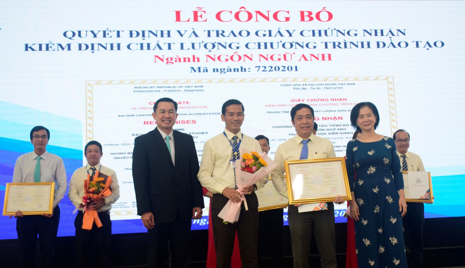 Đại diện Trung tâm Kiểm định Chất lượng Giáo dục Sài Gòn trao giấy chứng nhận kiểm định chất lượng giáo dục chương trình đào tạo cho lãnh đạo các khoa
