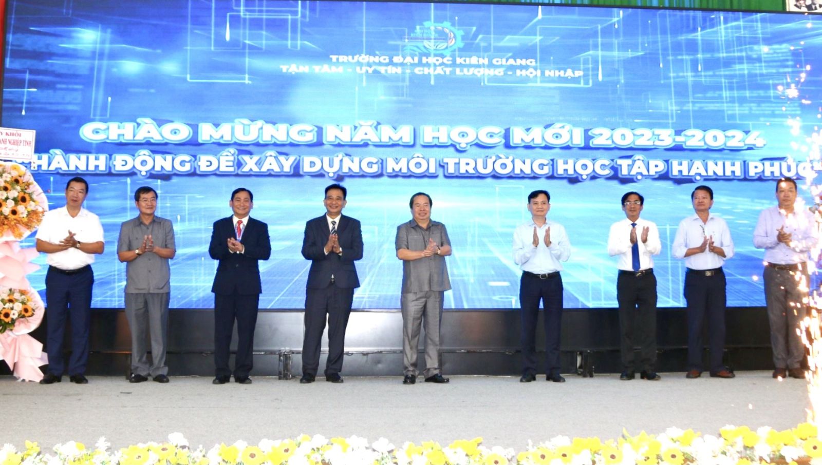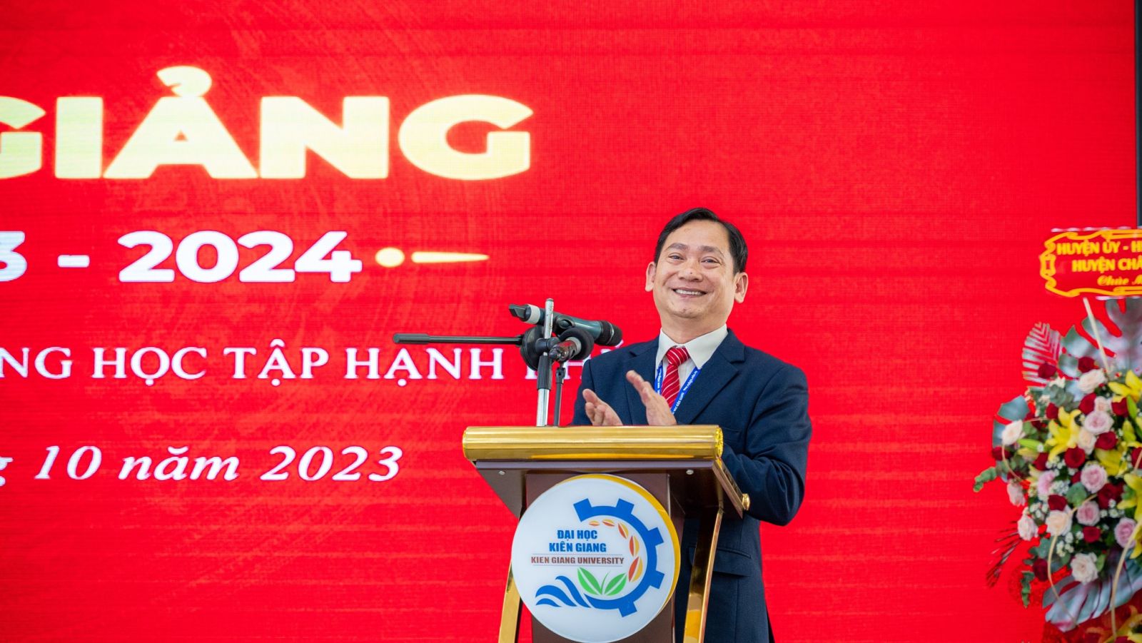 Phát biểu khai giảng, TS. Nguyễn Văn Thành – Phó Bí thư Đảng ủy, Phó Hiệu trưởng phụ trách Trường Đại học Kiên Giang cho biết năm học 2023 – 2024 Trường chọn chủ đề năm học là “Hành động để xây dựng môi trường học tập hạnh phúc”. Trường tiếp tục phấn đấu thực hiện thắng lợi mục tiêu, nhiệm vụ của năm học, gồm 80 chỉ tiêu với 101 chỉ số cùng với các kế hoạch kiến tạo không gian thi đua, lập thành tích chào mừng kỷ niệm 10 năm thành lập trường (21/5/2014-21/5/2024).