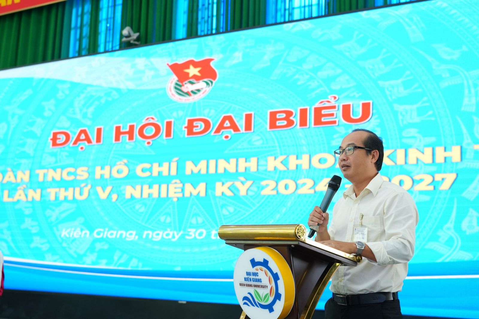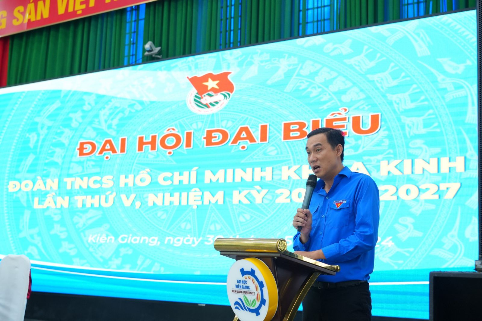 Phát biểu chỉ đạo tại Đại hội, ThS. Trịnh Lê Hoàng Tuấn – Bí thư Đoàn trường Đại học Kiên Giang nhấn mạnh Đoàn khoa Kinh tế cần tăng cường giáo dục thế hệ trẻ về lý tưởng cách mạng, đạo đức, lối sống văn hóa, nâng cao lòng yêu nước, xây dựng môi trường học tập, rèn luyện phát triển, tạo động lực cho thanh niên xung kích trong học tập, khởi nghiệp, lập nghiệp. Đổi mới nội dung, phương thức hoạt động, góp phần xây dựng Đảng và bảo vệ Chế độ XHCN. Đẩy mạnh các phong trào, hoạt động cách mạng, phát huy vai trò tiên phong, xung kích, sáng tạo của tuổi trẻ. Thanh niên, đoàn viên tiên phong, tình nguyện trong thực hiện nhiệm vụ chính trị, học tập, sẵn sàng chia sẻ vì cộng đồng, xung phong đến các vùng sâu, vùng xa, biên giới, hải đảo, sẵn sàng đi đâu nhận bất cứ việc gì khi tổ quốc cần. Chăm lo, củng cố, xây dựng tổ chức đoàn vững mạnh cả về chính trị, tư tưởng, đạo đức, lối sống. Nâng cao chất lượng đoàn viên có đủ năng lực và uy tín, chú trọng đào tạo bồi dưỡng xây dựng cán bộ đoàn tiên phong làm lực lượng nòng cốt.